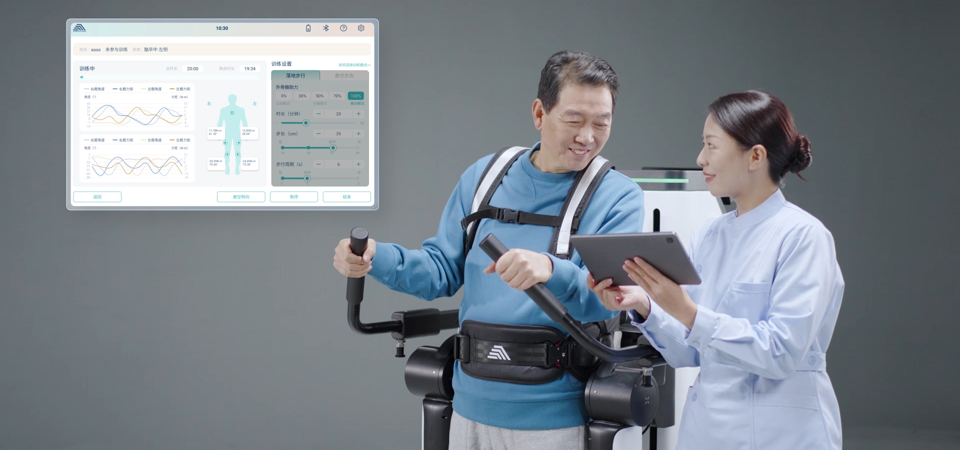 采用一體化人體工學(xué)設(shè)計(jì),結(jié)合自研的個(gè)性化仿生步態(tài)數(shù)據(jù)模型,通過(guò)高性能執(zhí)行器和控制算法驅(qū)動(dòng)步態(tài)機(jī)械腿,在康復(fù)早期為每位用戶(hù)匹配不同的節(jié)律性步行增 強(qiáng)其本體感覺(jué)輸入,促進(jìn)神經(jīng)系統(tǒng)的重組和代償。